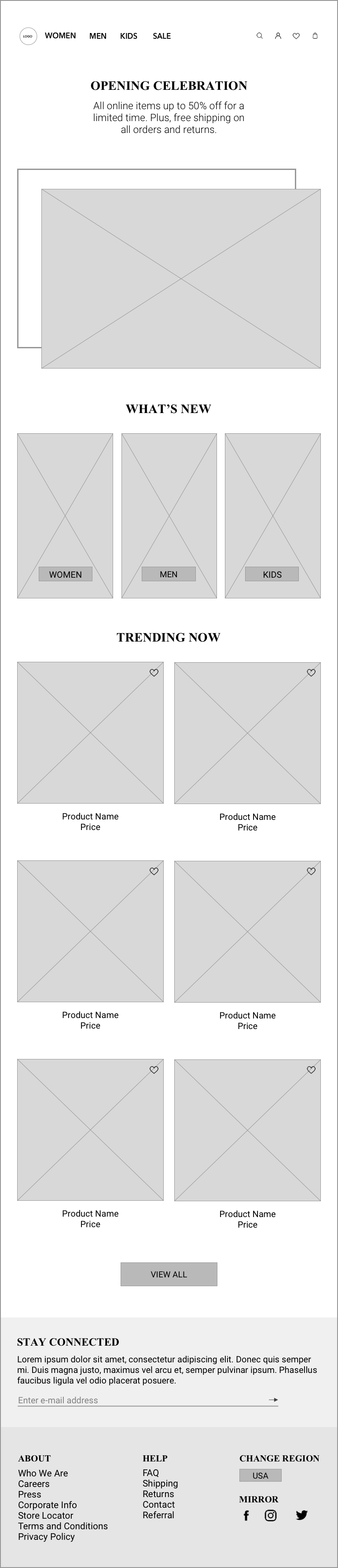 Once I had a better understanding of the target audience and some of their needs and frustrations, I shifted gears to work out what major features would need to be built into the website. Through a combination of industry standards and a card sorting exercise with users, I decided on using women, men, kids, and sale as the main navigation links. After mapping out the major features, I was then also able to figure out the hierarchy between them and the minor features.